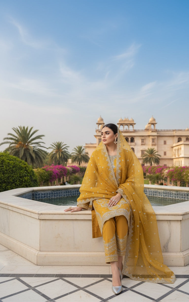 This appears to be an elegant, traditional South Asian three-piece suit (likely a shalwar kameez or trouser suit)