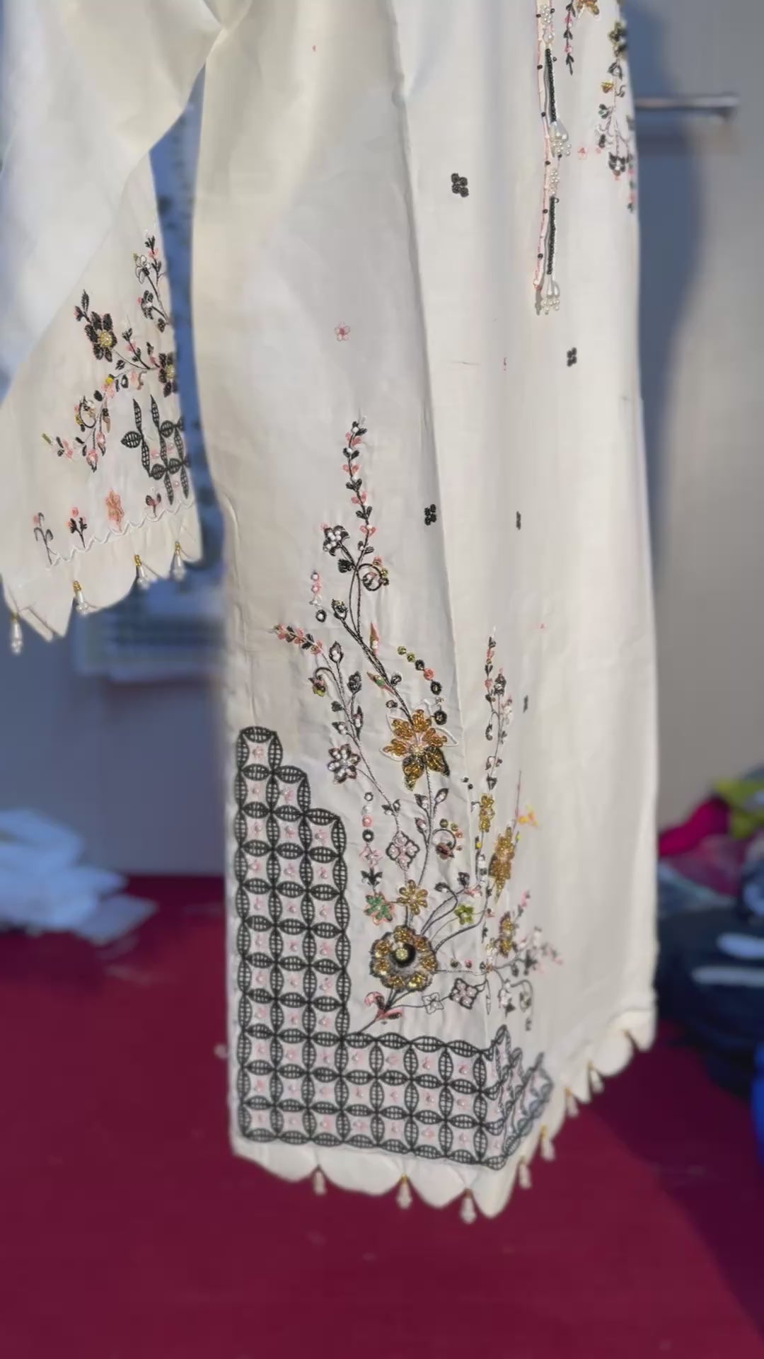 • Trousers: White straight-cut trousers with embroidered and lace-edged hems.