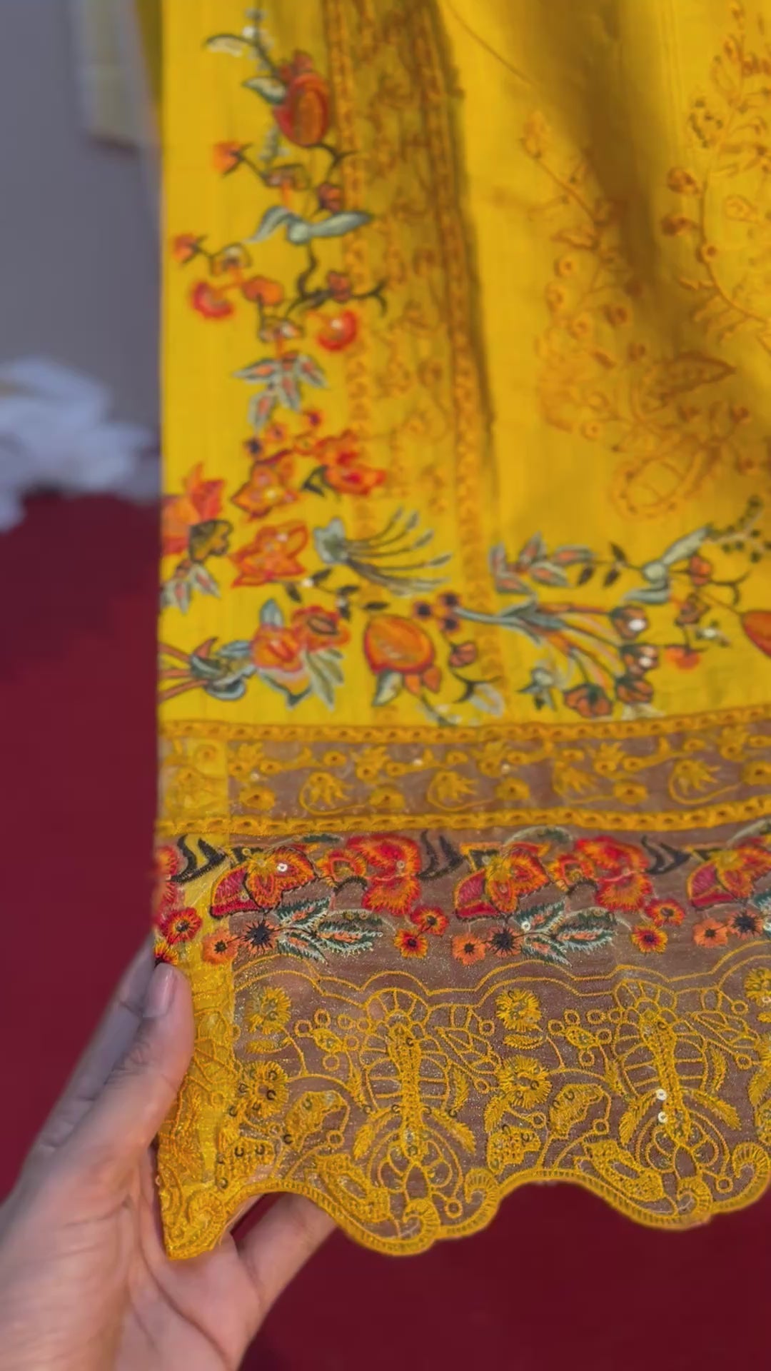 • Embroidery/Print: The neckline has delicate floral embroidery. The lower front (daman) features a striking border of vibrant, realistic floral prints in reds, oranges, and greens, contrasted beautifully against the mustard.