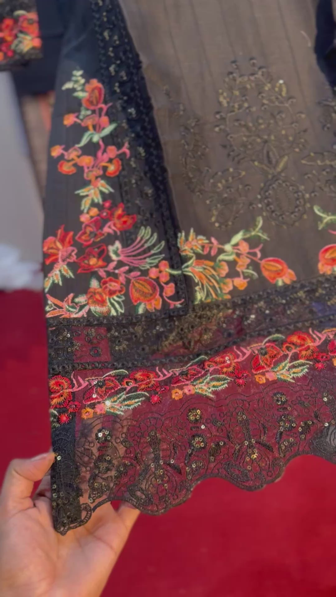 • Dupatta: A prominent shawl or dupatta in a contrasting black base, featuring an opulent, oversized digital or screen-printed floral pattern in the same rich red, orange, and green colors, creating a very luxurious and finished look.