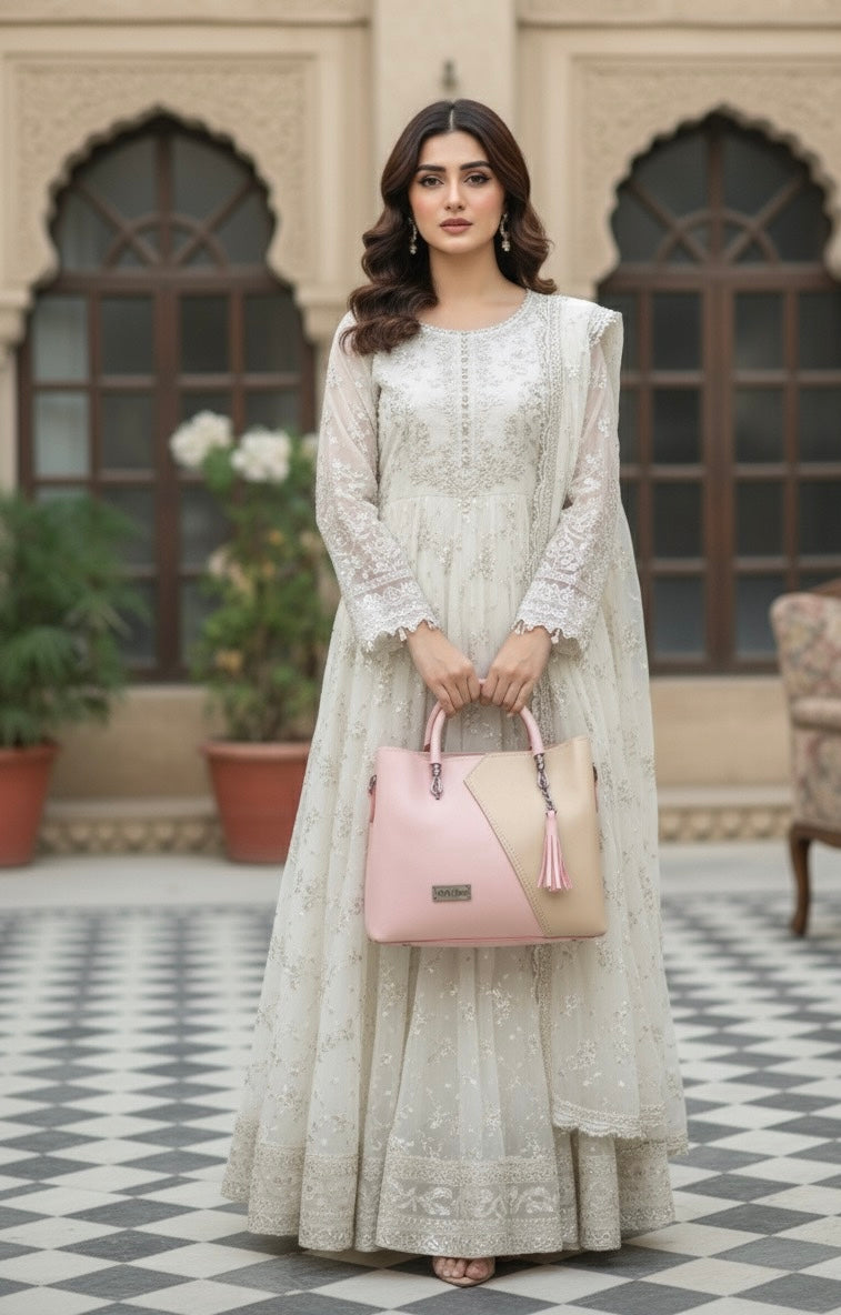 top-handle handbag with a distinctive two-tone color block design and a tassel charm accent 💼